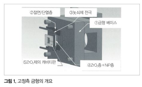 연구 그룹에서 시제작한 금형 중에 고정측의 개요를 그림 1에 나타냈다(가동측도 개략은 동일). 그림 중의 ①은 금형 베이스, ②는 금형 베이스와 ③의 전극을 절연하기 위한 절연판, ③은 NiP층에 급전하기 위한 놋쇠제 전극, ④는 전기 절연 및 단열을 위한 ZrO2층으로, 그 표면에 NiP층이 도금되어 있다.
