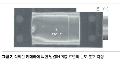 우선 적외선 카메라를 이용해 금형 표면의 발열 상황을 평가했다. 그림 2에 전류 9A로 60초간 가열한 결과를 나타냈다. 그림 중 좌우의 전극 부근이 고온으로 되어 있으며, 중앙에 띠 모양의 볼록 분포(중앙부는 고온으로 마커는 192.5℃를 표시, 상하 부분은 저온)이 얻어졌다.