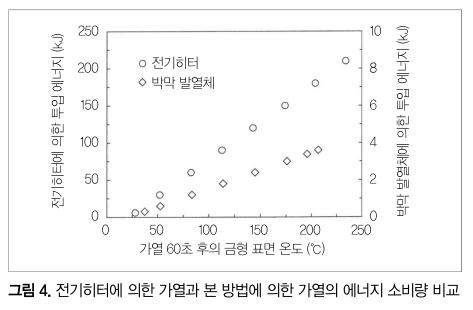 적용 시뮬레이션 소프트웨어를 이용해 박막 발열체를 이용한 방법과 기존 방법인 전기히터를 이용한 경우의 에너지 소비량을 비교했다(그림 4). 박막 발열체를 이용함으로써 계산 상의 에너지 소비량은 기존법의 약 1/50이 되는 것이 증명됐다.