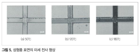 성형품 중앙의 미세 구조에 대한 전사 상황을 그림 5에 나타냈다. 금형 초기 온도 상승에 의해 전사 상황이 개선됐는데, 180℃에서는 성형품의 이형 시에 미세 구조가 끌려 변형되는 것에 의한 ‘쓰러짐’이 발생했다.
