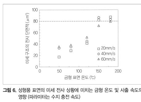 그림 6에 각 금형 온도, 사출 속도의 평가 결과를 나타냈다. 기본적으로 금형 초기 온도의 상승에 의해 전사 상황은 개선되고, 예측한 대로 유리 전이 온도(150℃)을 넘으면 거의 최대값으로 일정해졌다.