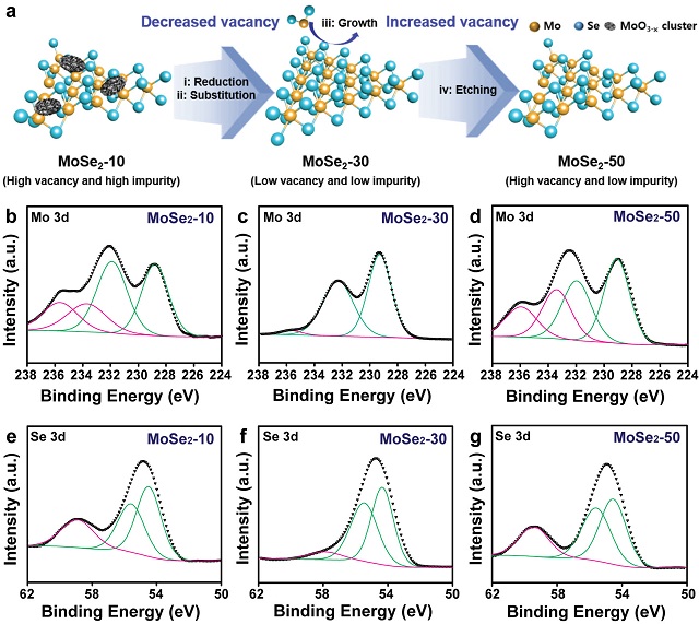 ▲ MoSe₂의 In-Situ 합성원리와 빈자리 결함(vacancy)에 따른 화학적 성분 분석 <자료 : UNIST>