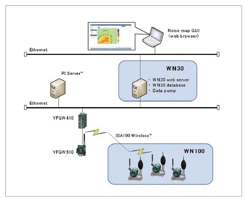 이 시스템의 주요 구성 요소는 WN100 무선 소음 측정기와 WN30 소음 매핑 소프트웨어이다. ISA100 Wireless 네트워크 프로토콜을 준수하는 WN100 센서는 공장 전체의 여러 위치에 설치하여 소음 수준을 측정하고 Yokogawa YFGW410 필드 무선 관리 스테이션과 같은 게이트웨이 장치를 통해 서버에 실시간으로 데이터를 전송할 수 있다.