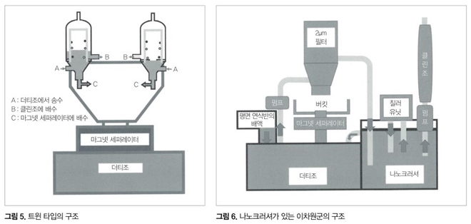 이것을 방지하기 위해 막힘이 없는 필터를 2대 교대로 배수함으로써 항상 1개의 필터는 클린조에 주수할 수 있게 되어 클린조를 최소한의 사이즈로 할 수 있다(그림 5). 그림 6에 나노크러셔가 있는 이차원군의 구조를 나타냈다.