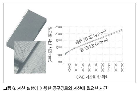 그림 6에는 실험에 이용한 다듬질가공용 공구경로와 계산에 필요한 시간을 그래프화한 것을 나타냈다. 실험은 공구의 배치 간격을 2.5, 2.0, 1.5, 1.0, 0.5, .02, 0.1mm로 변화시켰다. 공작물 모델의 사이즈는 150×70×20mm의 직방체 모양으로, 실험은 이 모델을 해상도 1,925×901×261의 3방향 덱셀 모델로 변환해 사용했다.