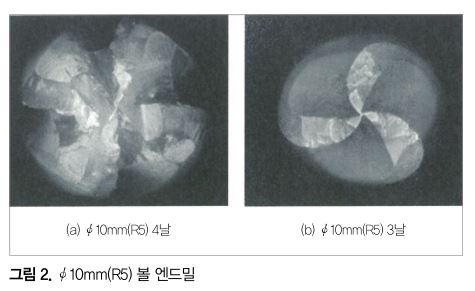 실제로는 절삭에 의한 강제 진동에서 자려 진동이 시작되어 날끝의 일부가 결손되고, 그 후 자려 진동이 크게 증대해 파손에 이르는 케이스는 거의 없었다. 더구나 비교를 위해 소경공구에 대해서도 조건을 S 6,000회전, F 4,160mm/min 이송, 피치 0.5mm, 절입 0.3mm로 실험을 했는데, 공구 강성이 낮아질수록 강제 진동이 일어나기 쉽고 강제 진동의 발생과 함께 날끝의 결손이 발생, 그 후 즉시 파손에 이르고 있었다(그림 2).