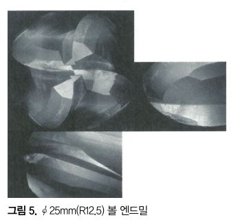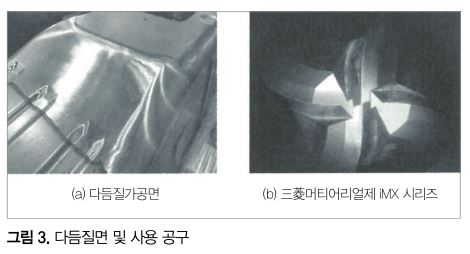 진동해석 결과로부터 고속 가공이 가능한 절삭 조건을 찾아낼 수 있었으므로 목표인 손다듬질 불필요를 실현할 수 있는 가공 피치의 조건을 채용, 실제 금형에 의한 테스트 가공을 했다(S 8,160회전, F 6,000mm/min 이송, 피치 0.5mm, 절삭값 0.3mm). 자려 진동의 유무에 대해서는 해석 결과대로 청각으로는 판단할 수 없는 레벨이 되고, 날끝의 결손도 육안으로는 확인할 수 없는 양호한 결과가 됐다(그림 3).