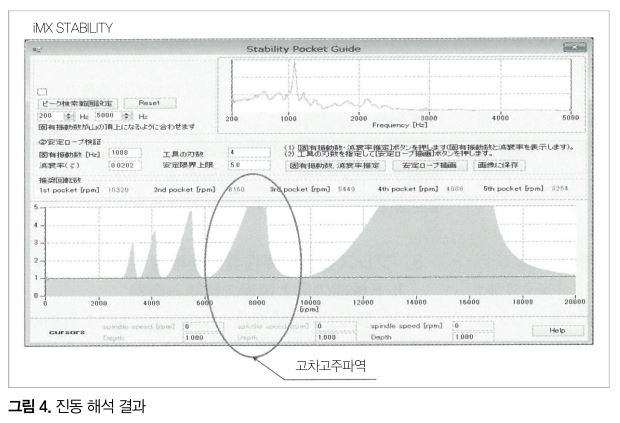 이번 대응에 의해 수정가공의 파손 요인이 명확해졌다. 또한 진동해석 결과로부터 고회전이 되는데, 고차고주파의 회전수(그림 4)를 적용함으로써 고속으로 안정된 가공을 실현할 수 있었다.