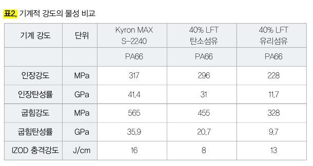 샘플을 그림 9에 나타냈다. 장섬유탄소강화 열가소성수지, 장섬유유리강화 열가소성수지 및 Kyron MAX(단섬유)의 기계적 강도의 물성 비교를 표 2에 나타냈다. Kyron MAX는 기계적 물성에 우위성이 있는 것을 확인할 수 있다.
