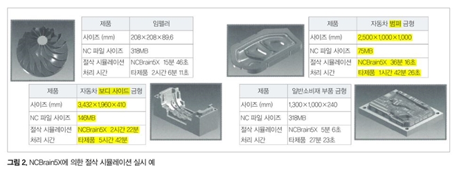 NCB사가 자사 개발한 솔리드 모델은 스톡 모델이 리얼타임으로 절삭되어 가는 모양을 확인할 수 있다. 또한 실제 가공에서 사용되는 NC 데이터를 이용해 시뮬레이션을 실시하기 때문에 실제 가공현장과 동등한 환경에서 간섭 체크를 할 수 있다. 더구나 기존의 머신 시뮬레이션 전용 시스템과 비교해도 압도적인 초고속 연산에 의해 시뮬레이션 시간이 짧기 때문에 스트레스 없이 현재의 제조 플로에 반영시키는 것이 가능하다(그림 2).