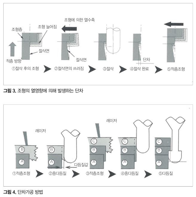 절삭면의 면조도 향상을 위해 단차가공이라고 부르는 절삭 방법에 의해 개선을 하고 있다. 그림 4에 나타냈듯이 조형에 의한 열수축을 예상한 다듬질값을 남기고 절삭, 상층의 조형에 의한 열영향을 받지 않았던 단계에서 다듬질가공을 한다.