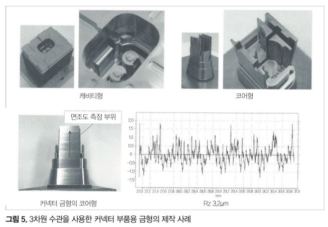 이 복합가공에 의해 3차원 수관이나 포러스 조형 등의 AM 기술의 특징을 활용한 커넥터 부품의 사출성형용 금형을 제작했다(그림 5). 복합가공에 의한 금형 부품의 일체화에 의해 가공 리드타임 절감(기존 공법의 38% 절감)과 3차원 수관에 의한 냉각 효과에 의해 사출성형의 사이클 타임 절감(기존 금형의 33% 절감)을 달성했다.