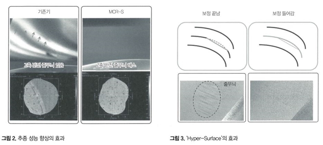 또한 가공 면품위 향상에는 기계만이 아니라 가공 프로그램도 큰 요인이 된다. 이에 동사의 가공 프로그램 보정기능 ‘Hyper-Surface(하이퍼 서피스)’의 적용에 의해 가공 중에 제어장치가 NC 데이터를 자동 보정함으로써 고면품위를 실현했다.