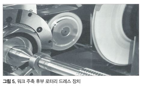 또한 다양한 나사 형상에도 대응하기 때문에 워크 주축 후부에 로터리 드레스 장치(그림 5)를 탑재하고 있다. 숫돌 형상은 목적으로 하는 형상별 대화 템플레이트를 가지고 있기 때문에 오퍼레이터는 도면대로의 숫돌 형상 제원을 필요한 항목에 입력하는 것만이다.