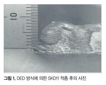 그림 1은 DED 방식에 의한 SKD11(60HRC) 적층 후의 사진이다. 이 그림에서 알 수 있듯이 적층 후에 1mm 이상의 단차를 확인할 수 있다. 절삭가공에서는 1mm를 넘는 절삭값의 불균일한 변화는 공구 수명에 큰 영향을 미치고, 수명 저하의 큰 요인이 된다.