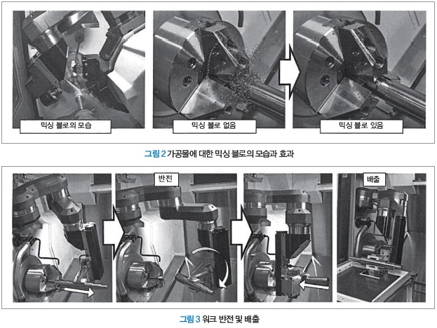 가공 서포트의 사례로서는 절삭수와 에어를 혼합시킨 믹싱 블로에 의한, 공구와 가공물에 대한 절삭칩 막힘의 억제가 있다. 로봇을 날붙이대의 반대측에 위치시켜 날붙이대와의 간섭을 피하면서 가공점을 향해 믹싱 블로를 가할 수 있다(그림 2). 가공점에서 발생하는 절삭분에 핀포인트로 믹싱 블로를 가함으로써 절삭칩의 흐름 방향을 제어하고, 절삭칩의 워크나 공구에 대한 막힘을 방지할 수 있다. 고정 노즐로는 불가능했던 가공 중의 블로 방향 변경도 가능하고, 절삭칩 막힘 제어에 효과가 높은 블로를 실현할 수 있다. 또한, 믹싱 블로에 의해 가공실 내를 정기적으로 청소해 절삭분의 축적을 방지함으로써 안정 가동을 실현한다.