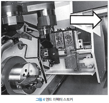 ‘LB3000EXⅡ ARMROID’는 로봇의 손끝에 장착하는 엔드 이펙터를 수납하기 위해 스토커를 기기 내에 설치하고 있다. 용도에 따라 로봇은 엔드 이펙터를 자동 교환하는 것이 가능하고, 스토커에는 3종류의 엔드 이펙터를 수납할 수 있다(그림 4).