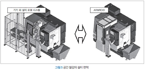 로봇이나 엔드 이펙터 스토커를 기기 내에 설치함으로써 공작기계 본체의 크기를 넓히지 않고, 워크 스토커를 조작 도어 앞에 준비하는 것만으로 자동화 셀을 구축하는 것이 가능하다. 기존의 기기 외 설치 로봇 시스템은 공작기계 본체와 로봇 본체, 워크 스토커, 안전펜스를 포함한 넓은 공간이 필요했지만, 기존의 로봇 시스템에 비해 축소된 설치 면적으로 자동화 시스템을 실현하고 있다(그림 5).