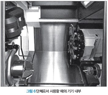 로봇을 사용하지 않는 경우, 그림 6과 같이 로봇을 주축 상부의 가공에 방해가 되지 않는 장소에 콤팩트하게 수납함으로써 오쿠마의 CNC 선반이 가진 넓은 가공 영역, 높은 가공 성능을 희생하지 않고 단체기로서 사용할 수 있게 했다.
