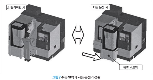 그림 7과 같이 워크 스토커는 간단히 슬라이드할 수 있는 이동식 구조로 하고 있으며, 자동화 셀로서 사용할 때는 워크 스토커를 조작 도어 앞에 배치, 단체기로서 사용할 때는 작업에 방해가 되지 않는 퇴피 위치로 이동시킴으로써 단체기로서의 사용과 로봇 자동화 셀로서의 사용을 전환하는 것이 가능하다.