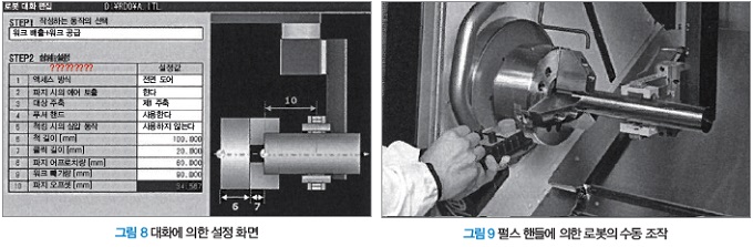 또한, 공작기계의 조작에서 사용하는 펄스 핸들로 로봇의 수동 조작이 가능하고, 워크 탈착 포인트 설정 등의 미세한 위치맞춤이 필요한 작업을 쉽게 하는 것이 가능하다(그림 9). 수동 조작, 자동 운전의 어느 쪽이나 리얼타임으로 기계의 간섭을 체크해 로봇의 충돌을 방지하고, 로봇 초심자라도 도입 첫날부터 안심하고 조작하는 것이 가능하다. 이러한 조작계를 실현함으로써 좁은 기기 내에서도 로봇이 부딪치지 않고 기계와 동일한 조작감으로 안심하고 로봇을 다룰 수 있게 했다.