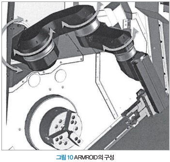 ‘ARMROID’의 최대 특징은 CNC 선반의 가공실 내(기기 내)에 로봇을 탑재한 것에 있다. 로봇이 기기 내에 있기 때문에 기존의 기기 외에 설치한 로봇으로는 불가능했던 가공 중의 기기 내 로봇 작업을 실현했다. 공작기계와 로봇이 협조 동작함으로써 지금까지 숙련작업자가 하고 있던 가공 서포트를 대행하는 동시에 오퍼레이터의 부하를 경감한다.