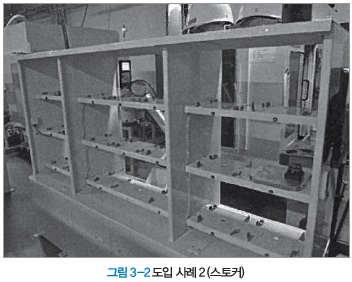 수직형 머시닝센터 1대에 대해 가반 10kg의 협동 로봇이 탈착을 하는 시스템이다. 도입에 걸린 기간은 5개월. 양산(흐름)가공이 안정적으로 시작되기까지는 4개월이 더 소요됐다. 이 시스템은 연동에는 이르렀지만, 투자 회수 기간의 예측은 당초 계획의 2배가 됐다. 실패 부분이 3가지 있었다. ①도입 기간이 길다, ②리스크 액세스 매니지먼트의 수정, ③스토커 청소 관리 공정의 증대이다.