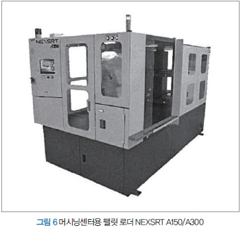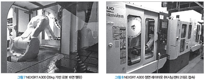 그림 6은 머시닝센터용 NEXSRT A150/A300이다. 다관절 로봇에 의한 지그 세정을 할 수 있기 때문에 절삭분과 절삭유 제거의 신뢰성이 높고, 3축 머시닝센터에서도 사용할 수 있다(그림 7). 또한 2대의 머시닝센터와 접속할 수 있는 점도 특징이다(그림 8). 회전식 스토커(그림 9)는 깔끔하게 수납되는 레이아웃으로, 다양한 공작기계 메이커의 머시닝센터와 접속 가능하다.
