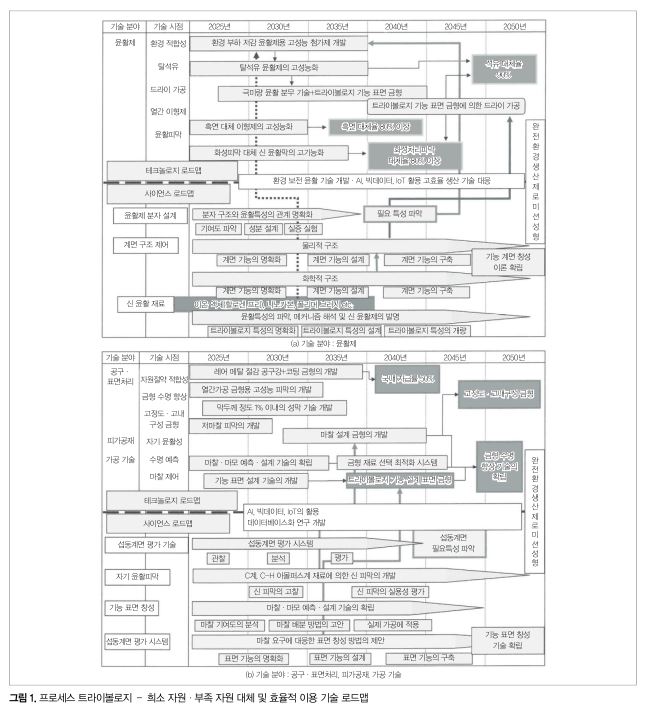 이와 같이 트라이볼로지에 대한 요망은 다종 다양하다. 일본소성가공학회의 하부 조직의 하나로 소성가공의 트라이볼로지를 전문으로 연구하는 프로세스 트라이볼로지 분과회가 있으며, 그림 1과 같은 로드맵을 내세워 활동하고 있다.