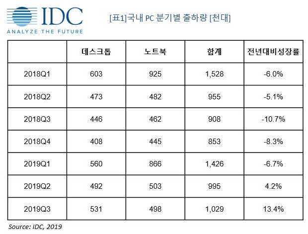 IT 시장분석 및 컨설팅 기관인 인터내셔날데이터코퍼레이션코리아 (International Data Corporation Korea Ltd., 이하 한국IDC)의 국내 PC 시장 연구 분석에 따르면, 2019년 3분기 국내 PC 출하량은 데스크톱 53만대, 노트북 49만대, 합계 102만대로 전년 대비 13.4% 증가했다.