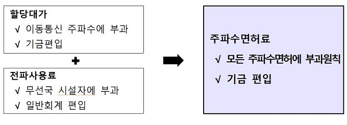 현행 할당대가, 전파사용료로 구분된 체계를 주파수면허료로 통합하고, 정보통신진흥 등 목적에 맞는 사용을 위해 기금(정보통신진흥기금, 방송통신발전기금)에 편입한다.
