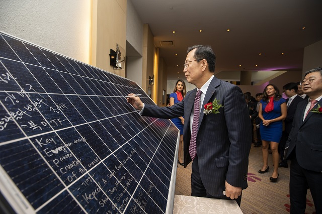 ▲ 김종갑 한전 사장이 태양광 패널에 기념 사인을 남기고 있다. <사진 : 한국전력>