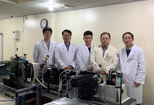 ▲ 암 치료기용 X-Band 선형가속기 시스템 및 연구팀(왼쪽부터 KERI 김상훈 연구원, KERI 김근주 박사, KERI 이용석 박사, 서울성모병원 강영남 교수, KERI 김정일 박사) <사진 : KERI>