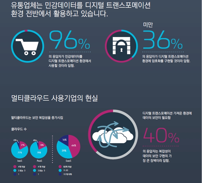 보고서에 따르면 전체 응답 기업의 95%이상이 1년내에 IaaS, SaaS 및 PaaS와 같은 3가지 이상의 클라우드 환경을 사용할 계획임이 밝혀졌다. 이들 중 50% 이상은 하나의 클라우드 서비스 공급업체가 아닌 둘이상의 이기종 클라우드를 사용할 계획이라고 밝혔으며, 70%는 26개 이상의 SaaS 애플리케이션을 사용할 계획이라고 답했다. 또한, 76%의 응답 기업은 이러한 클라우드 환경에서 민감데이터를 활용할 것이라고 밝혔다. 멀티 클라우드 활용빈도가 높다는 것은, 유통기업들이 민감데이터를 보호하는 데 어려움을 겪고 있음을 의미하는데, 이는 환경에 따른 각각의 고유 데이터 보안 접근법을 필요로 한다.