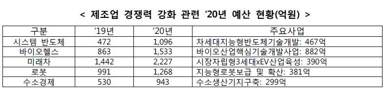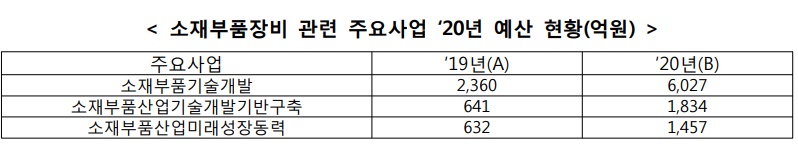 분야별로는 일본 수출규제에 대응하여 소재부품장비 산업 지원을 위한 산업부 예산이 올해 6699억 원에서 내년도 1조 2780억 원으로 대폭 증액됐다.