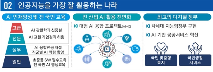 또 어릴 때부터 쉽고 재미있게 SW와 AI를 배우고 모든 연령·직군에 걸쳐 전 국민이 AI 기초 역량을 습득할 수 있는 교육체계를 구축하는 한편, 세계 최고의 AI 인재가 성장하는 토양을 조성할 방침이다.