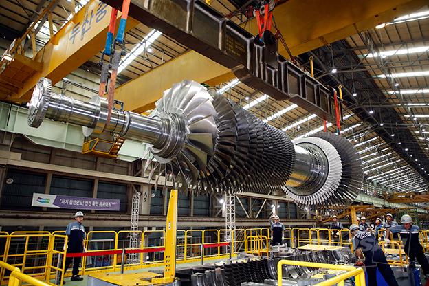 ▲ 올해 9월 두산중공업 창원 본사에서 진행한 발전용 대형 가스터빈 최종조립 작업 모습, <사진 : 두산중공업>