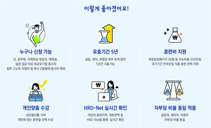 특히 기존 1∼3년이었던 유효기간은 5년(재발급 가능)으로 연장해 정부 지원 훈련비를 본인이 필요한 시기에 탄력적으로 활용할 수 있도록 했다.