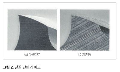 또 다른 하나의 공통된 특징으로서 절삭성이 높은 점을 들 수 있다. 그림 2에 스퀘어 형상의 DHR237과 기존품의 날끝 단면의 비교를 나타냈다. 동전극 가공용 엔드밀 시리즈는 기존품에 비해 날끝을 예리하게 함으로써 절삭성을 높이고 있다.