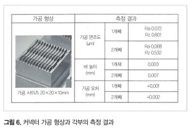 그림 6에 커넥터 가공 형상과 각부의 측정 결과를 나타냈다. 가공 면조도는 1개째 Ra 0.072µm, 2개째 0.068µm, 버 높이가 1개째 0.003mm, 2개째 0.007mm, 가공 오차는 1개째+0.001mm, 2개째+0.002mm가 되어 안정된 양호한 가공 정도가 얻어진다.