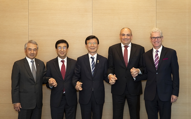 ▲(왼쪽부터)Bronson Hsieh 양밍 회장 겸 사장, 배재훈 현대상선 사장, 문성혁 해수부장관, Rolf Habben Jansen 하팍로이드 사장, Jeremy Nixon ONE 사장