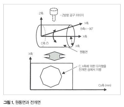 회전축과 직진축에 의한 동시 운동에 대해 그림 1과 같이 회전축과 직진축의 동기 운동을 전사하는 원통면 및 전개면을 도입한다. 그림1 아래 그림의 Cs축(mm)은 전개면에서 회전축에 의한 이동축이다.