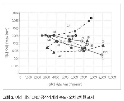 이와 같은 결과가 각 테스트 케이스마다 8시트 얻어졌다. 이들로부터 그림 3과 같이 실제 속도와 최대 오차에 주목해 2차원 그래프로 표현함으로써 여러 대의 CNC 공작기계 회전축․직진축의 고속․고정도성을 1개의 그래프로 평가, 비교할 수 있다.