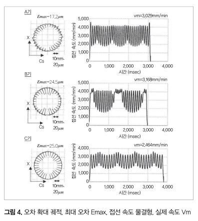 그리고 속도와 오차에 의한 2차원 그래프에서 고속․고정도성 평가를 한다. 실제 궤적의 채취는 다음 항에서 설명한다. 또한 그림 1의 위 그림에서 B축=-90°로 해 C축과 X축에 주목한 원통면의 그림으로 하고 있는 것은, 수직형 머시닝센터에서 -Z방향의 공구로 원통면을 가공하는 상태를 가정하고 있기 때문이다.