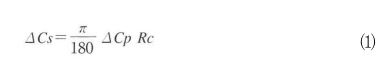 회전축(C축)의 프로그램 상의 상대이동량 △Cp(°)에 의한 전개면 상의 이동량 △Cs(mm)의 관계는 식 (1)로 표현된다. Rc는 원통 반경이다.