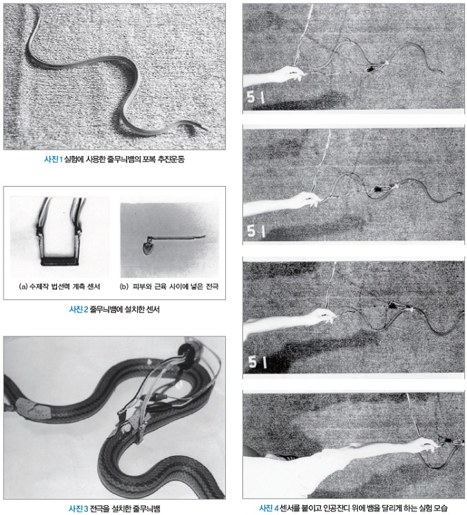 또한, 뱀이 추진 중에 내는 근력은 근전류로 측정하기로 했다. 근전류의 계측법으로서는 침전극법과 표면전극법이 있는데, 근육에 침을 찔러 근전류를 계측하는 침전극법은 전류가 너무 작고, 피부 상에 전극을 붙이는 표면전극법도 뱀의 비늘이 방해가 되어 계측할 수 없었다. 그래서 아마추어 발상으로 사진 2(b)와 같은 전극을 동판으로 만들고, 뱀의 피부를 잘라 피부와 근육 사이에 삽입하는 좀 거친 방법을 시도했다. 결과는 양호해서, 피부와 근육 사이의 도전성 체액의 도움으로 충분한 신호를 계측할 수 있었다.