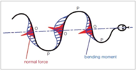 필자의 계산으로는 뱀이 서둘러 도망치려고 활주하면, 그림 1과 같이 몸통의 근육 분포는 산 모양의 곡선이 되고 지면을 미는 법선력은 O점 주변에 집중하는 분포가 되는 결과가 나오게 되어 있었다. 정말일까 하고 생각했지만, 그림 2와 같이 뱀의 활주 데이터에 그러한 경향이 실제로 관측되어 놀랐다.
