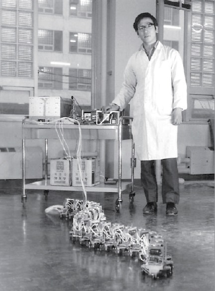 사진 6에 나타낸 전체 길이 2m로 전체 20절의 뱀 로봇을 만들기 시작한 것은 필자가 석사 과정 2년째였던 1972년 9월부터였다. 20절이었기 때문에 부품도 모두 20개 단위로 만들게 되어 매우 힘들었지만, 손재주가 있어서 설계 시작부터 완성까지 3개월 정도로 가능했다. 지금까지 해보지 않았던 종류의 전자회로에 대해서는 이시다 아키나리 조교(현 의과 치과대 명예교수)에게 배워서 만들었다.