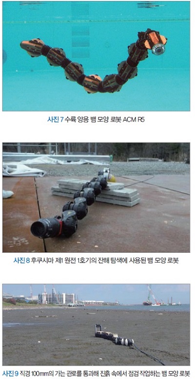 사진 8은 능동적으로 구부러지는 몸통뿐만 아니라, 반구 모양의 바퀴도 능동적으로 해서 운동성을 높인 뱀 모양 로봇이다. 완전 방진 방수이며, 각 관절에는 토크 센서와 과부하 보호장치가 설치되어 좁은 잔해 속의 형상에 적응해 이동할 수 있고 끝단과 뒷부분에 탑재된 카메라로 좁은 곳의 점검 작업이 가능하다. 이 로봇은 시미즈건설의 요청으로 후쿠시마 제1 원전 1호기 건물 내의 상황을 조사하기 위해 실제로 사용되고 있다.