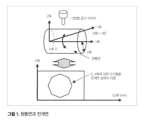 회전축과 직진축에 의한 동시 운동에 대해 그림 1과 같이 회전축과 직진축의 동기 운동을 전사하는 원통면 및 전개면을 도입한다. 그림 1 아래 그림의 Cs축(mm)은 전개면에서 회전축에 의한 이동축이다.